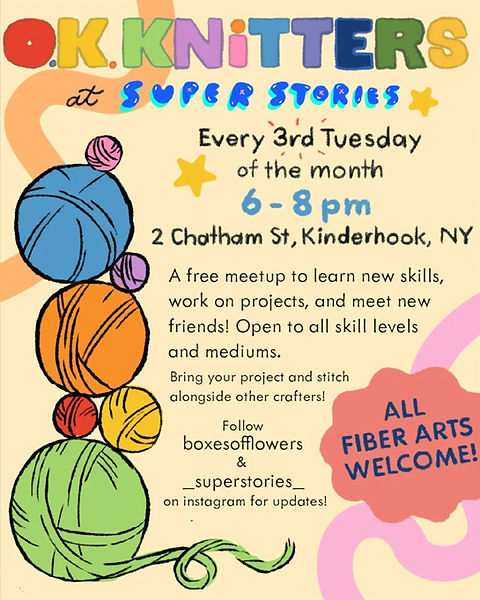 Join us for OK Knitters, hosted by our friend, Priscilla Rapp of Nine of Swords Yarns. This is a lovely chance for local fiber artists to get together and share techniques! This Club will be meeting the third Tuesday of each month. No registration required.